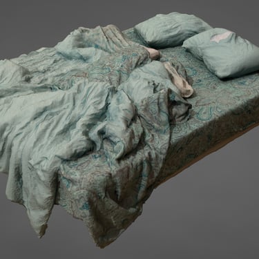 This is the main scan that I set out to get. It's large and doesn't fit in my turntable space. But it has plenty of details for camera alignment. I ended up getting 250 images in overcast lighting and just about everything meshed well. You can't move anything around because it is scanned as it was, but I did grab a turntable scan of a matching pillow below, so you have a tiny bit of ability to dress your scene. I absolutely love capturing real-life organic subjects like all the folds in these blankets and sheets. Just so much fun when it directly translates from the real subject.