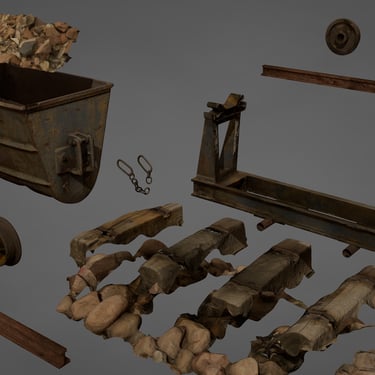 To say that I'm a little excited about this asset post is just a tiny bit of an understatement. This is one of my best scans and I've had some fantastic clean up work done by Vitaly. And now you get to have it to download right here! This mining cart was a bit of work just to locate a proper subject. I visited mines up in the Rockies and wasn't really satisfied because most of the gear was too modern. I'm going for a gold rush era look. At any rate I finally located this suitable subject at the School of Mines just down the street. It was setup outside and had Museum lettering running across one side. It was too close to the building which made it hard for me to get some of the sides of the cart but also helped because I could climb up the building a tad and get some great overhead shots from higher up. It took me about an hour or so to scan it in 502 RAW images. But once the processing was run I was the proud owner of this very clean scan. Vitaly when to work breaking it all out into it's pieces and remodeling it all, reprojecting, et cetera. And here it is, enjoy!